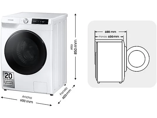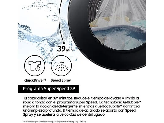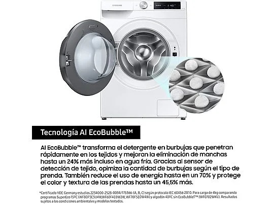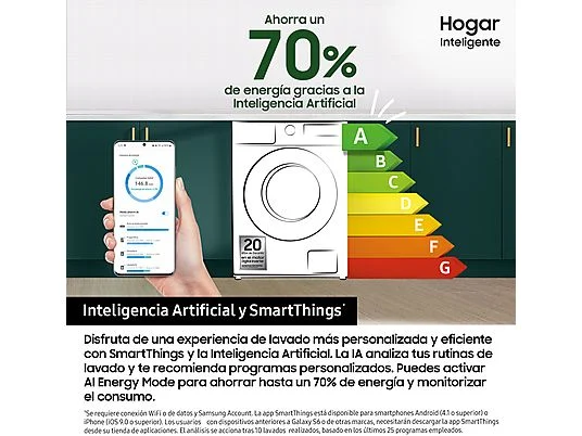 Disfruta de una experiencia de lavado más personalizada y eficiente con SmartThings y la Inteligencia Artificial . La IA analiza tus rutinas de lavado y te recomienda programas personalizados. Puedes activar AI Energy Mode para ahorrar hasta un 70% de energía y monitorizar el consumo.