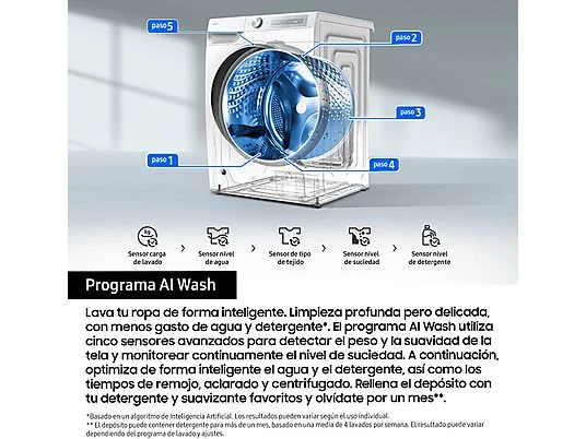 Limpieza profunda pero delicada, con menos gasto de agua y detergente . El programa AI Wash utiliza cinco sensores avanzados para detectar el peso y la suavidad de la tela y monitorear continuamente el nivel de suciedad. A continuación, optimiza de forma inteligente el agua y el detergente, así como los tiempos de remojo, aclarado y centrifugado. Rellena el depósito con tu detergente y suavizante favoritos y olvídate por un mes**.