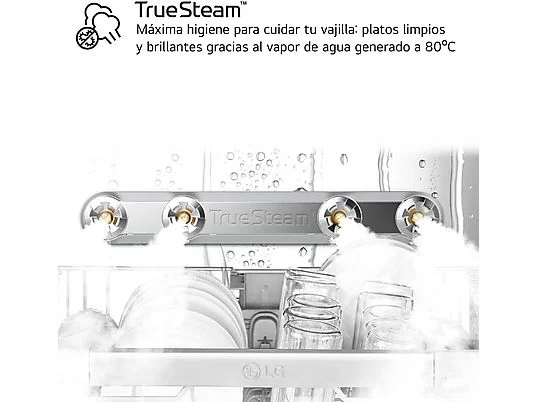TrueSteam™: máxima higiene. Limpieza con vapor de agua generado a 100ºC. Platos limpios y brillantes, el vapor reduce hasta un 30% de marcas de agua